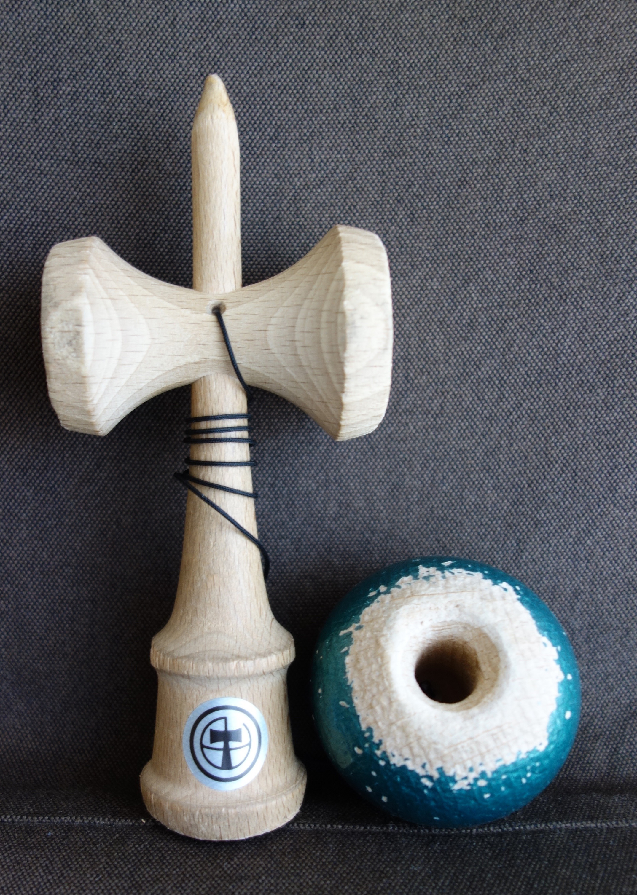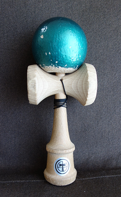 使用したけん玉は、ENGI KENDAMAの初代のモデルでBコートと呼ばれるペタペタの塗装が施されたけん玉です。イベント限定カラーのグリーンがとても綺麗で気に入っています。このけん玉は2017年のTOKYO KENDAMA DAYという催しに参加した際に、ENGI KENDAMAブースにいらしたの製作者の方から直接購入した思い出深き一品です。ブナを使用したけん玉で、持った感じはやや細身に、そして軽く感じます。なので、使う時は、自然と余計な力が抜け、「うぐいす」や「たけうま」といったバランス技がやり易いのかも知れません。(使い込んだため、穴が広がっていることもやり易い要因と思います。そのせいかある別のイベントでは、このけん玉をミニゲームで使用された主催者の方から「うぐいすマシーン」なる異名を授けて頂きました。)