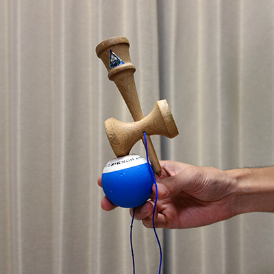 たけうまの魅力は、乗せてからもさらに続きます。ここからどんな技につなげようか、思案を巡らす時間はまた格別です。灯台、さかおとし、とんぼ返り、持ち替えてけんなど、いろいろとありますが、今回はダウンスパイクへつなげました。穴の位置が変わらないよう慎重に上へ投げ、素早くけんに持ち替えてダウンスパイクをします。ダウンスパイクは見た目も派手でいいですし、何よりけん玉の音を楽しめる技だと思います。素材や形状によってけん玉ごとに異なる様々な音色を、ダウンスパイクを通じて楽しむというのも良いのではないでしょうか。